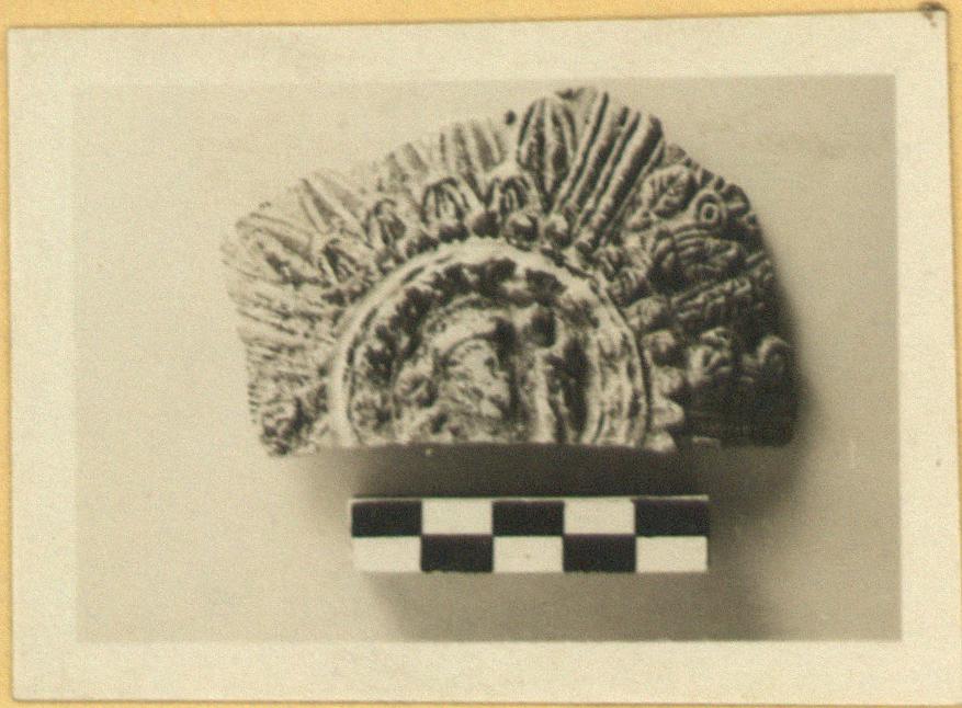 | Description: | From the bottom of a Megarian bowl. The medallion surrounded by a ring where the glaze is scratched away; around its edge, small rosettes; in the center, woman's head between two children. Around base of body, small leaves from which spring alternating systems: a) large leaves with pointed petals; b) elongated leaves, between which are two vine plants separated by a trellis-like pattern. Pinkish buff clay, black glaze. | |