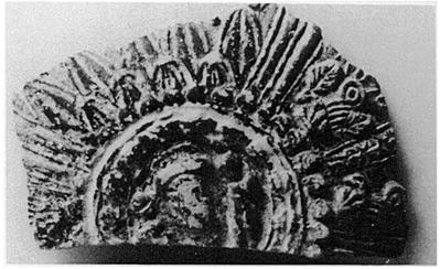 | Description: | From the bottom of a Megarian bowl. The medallion surrounded by a ring where the glaze is scratched away; around its edge, small rosettes; in the center, woman's head between two children. Around base of body, small leaves from which spring alternating systems: a) large leaves with pointed petals; b) elongated leaves, between which are two vine plants separated by a trellis-like pattern. Pinkish buff clay, black glaze. | |