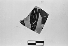 | Description: | From a kylix(?) of the comast group; black glaze inside. Outside, the rump, painted red, of a dancer; a belt, incised, above, and an arm and hand hanging down behind. | |