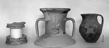| Description: | a) The neck of an amphora with part of the shoulder and one handle. The neck, slightly concave in profile, widens as it goes up, ending in a flaring rounded lip. Straight vertical strap handles, shoulder to neck. Lip and two lines at base of neck. St. Andrew's crosses on handles in black glaze. On neck, front and back, a long vertical line above a rectangle crossed inside. Pinkish buff clay, heavy creamy slip. b) Found inside fragment a) used as a lid; an amphora base, of similar fabric. High ring foot, glazed black on outside. c) Further down, as a secondary stopper, another similar base. | |