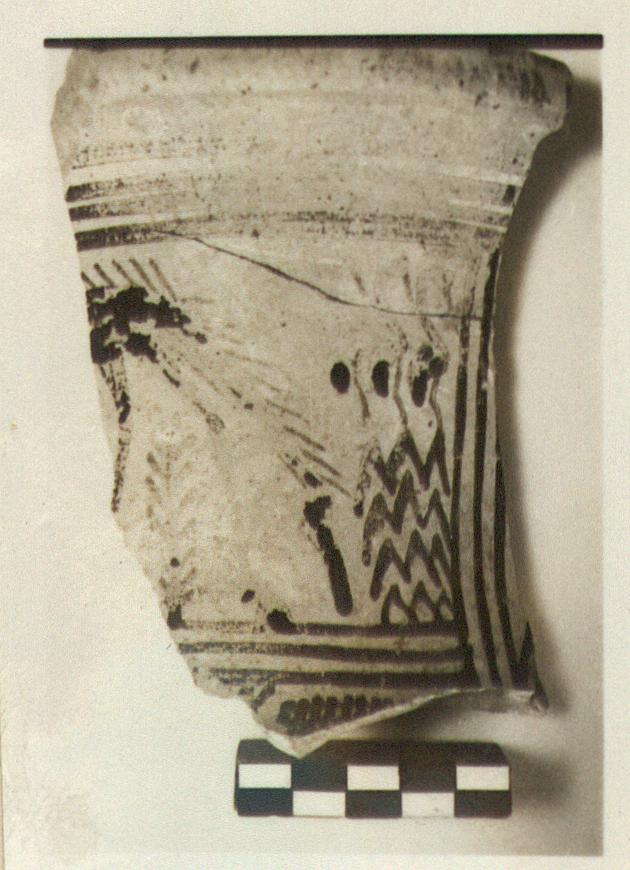 Description:   a) From neck of a geometric amphora. Part of one metope panel, bounded by triple lines on all sides. On it, head and front legs of a grazing horse, right. Between legs, tree; between front leg and head, snake; in front, parallel zigzag lines with three birds perched on their beaks.