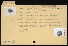 | Description: | Mended from two pieces; complete save minor chips. Large perforated convex bottom. Sixteen perforations ca. 0.003 in diameter. Buff clay. Traces of white and red. Salt shaker(?). | |