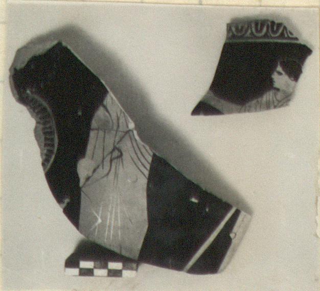 | Description: | Seven pieces mending up to five. Shiny black inside, with reserved line below rim. a) Base of handle; beside it, standing figure right, in himation; part of the staff and drapery of another figure facing. b) From the rim, turned outward with egg pattern below. c) Part of the handle. d) From just below the rim, with part of the egg pattern. Head and outstretched right arm of a woman, left. e) The knees of a dancing youth. In front of him, part of a torch. No relief contours. White for the woman's triple fillet. Cf. VP, pl. 19, no. 4. | |