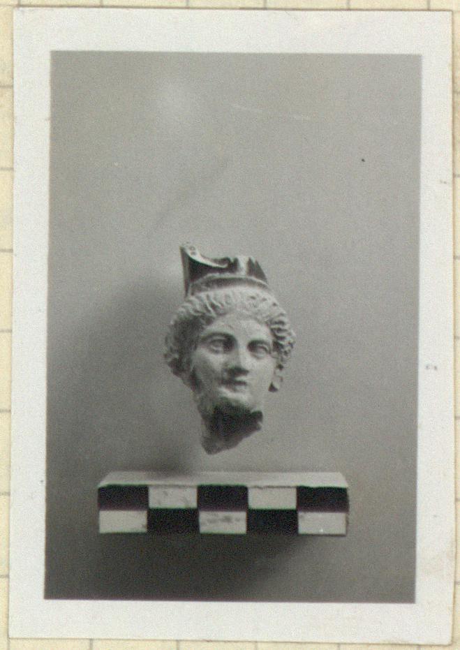 | Description: | From a lekythos; the lip rises from the top of the head, the handle from the back of the neck. Head of a woman wearing tiara and earrings; traces of yellow in the hair. | |