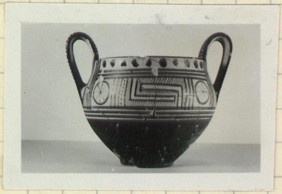 | Description: | Mended from many pieces; a few small bits missing from the wall. Flat-bottomed kantharos with convex-concave body ending in a plain rim. Two high vertical handles. Lower body glazed; above the glaze, three black bands. Handle zones set off by diagonal hatching between three vertical lines each side. On shoulder, bounded above by three horizontal lines below linked dots at the lip, three metopes: 8-spoked wheels at sides, and in rectangular center metopes, a maeander section. Glaze on upper face of lip. Interior glazed save for dot at center of floor and reserved band inside lip. Horizontal strokes on outer faces of handles. Buff surface; glaze black to brown. | |