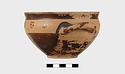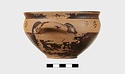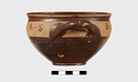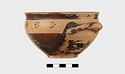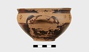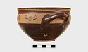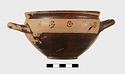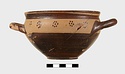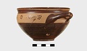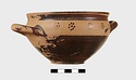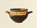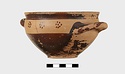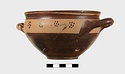 | Description: | Intact. Exactly like P 4773 (Β 1241) and P 4774 (Β 1242) in shape and decoration. On reserved handle band, five dot rosettes on one side, four on the other. Nine series of short hatched lines on reserved stripe inside lip. The glaze dark reddish brown to black; inside, chocolate brown. ADDENDA P 4773 and P 4774 are flat-bottomed cups with narrow straight lip and two horizontal loop handles, tilted slightly upward. Lower body and handles glazed black. | |