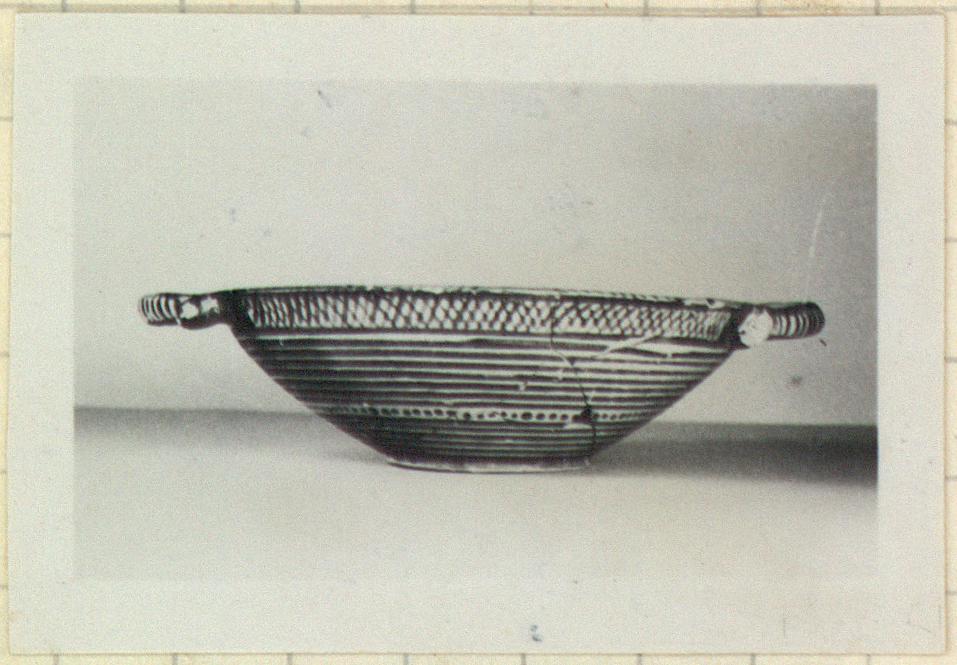 | Description: | Mended from many pieces. Shallow bowl with low ring base and flaring, slightly convex side wall with outward-projecting lip, flat on top. Two horizontal loop handles at level of lip, outward-turned ends. Interior glazed black on upper face of rim, parallel strokes alternating with St. Andrew's crosses. On outer faces of handles, vertical parallel strokes. Cross hatching below lip outside. Entire body covered with narrow glaze bands, interrupted once by a band of dots. On foot, concentric circles around a many-spoked wheel. Buff slip; metallic black glazze. | |
