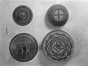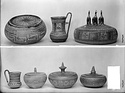 | Description: | Intact. a) Flat-bottomed bowl-shaped pyxis; convex side wall, flanged inside to receive lid. Lid and flange pierced for fastening. On pyxis body, at bottom: three bands, zigzag, three bands. A wide band divided by series of three vertical strokes into 16 metopes filled by birds and 4-petalled flowers alternating, the flowers each with four auxiliary straight dotted petals; in the field, horizontal and vertical rows of dots and zigzags. Above, to rim, a zigzag with three horizontal lines above and below. On bottom, inside three rings, a flower with 4 hatched petals; stars in field between ends of petals. b) Lid: flat round lid decorated with series of three narrow, one wide glazed band, alternating. Spiked knob handle with narrow glazed bands. Reddish buff clay, dull rather metallic black glaze. | |