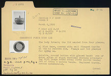 | Description: | The body intact; the lid mended from four pieces. a) Flat base, convex side wall flanged inside at rim to receive lid. Flange and lid pierced for fastening. Outside, around bottom with glazed band: row of dots; series of eight vertical strokes alternating with large round dots; three narrow bands; row of dots; four narrow bands. Unglazed inside. Bottom undecorated. b) Lid: flat, with spike handle, truncated. From outer edge: four narrow bands, row of dots, two narrow bands, row of dots, two narrow bands, wide band around handle. On handle, narrow bands. Buff slip; black glaze badly peeled. | |