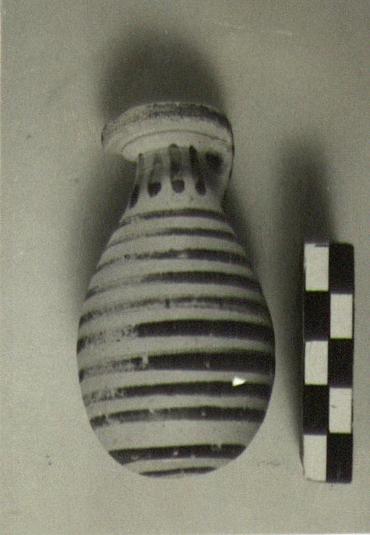 | Description: | A small part of the lip is broken off. On neck, vertical petals; otherwise body and lip decorated with horizontal bands of brownish black glaze. Corinthian clay. | |