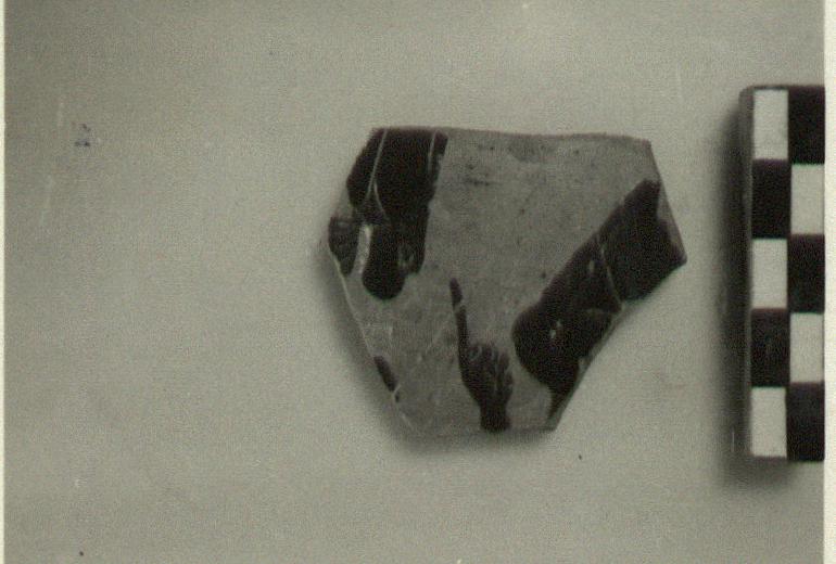 Description:   From a large closed pot, amphora. The head of a horse right, and a hand beckoning it onward. Part of (perhaps a person?) at right. Careless incision. Added white for the teeth.