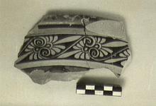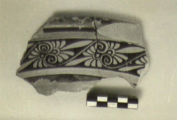 | Description: | From a calyx krater. Outside, below the rim, diagonal slanting pointed palmette pattern. A trace of some representation below. Black glaze used for outlines and for the background of the palmette pattern; the rest has been fired a sealing-wax red. Partial contours for the palmettes. | |