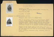 | Description: | Fragment from the neck of an amphora. Part of an animal frieze is preserved; at right, a lion moving right, his head and lower legs missing; behind him an outstretched wing, with a rosette above. Above these, two narrow glazed bands at the bottom of another frieze, which preserves traces of an animal (lion?) moving left. Purple on the inner part of the wing, and one streak on the hind quarters of the lion. Incision for the feathers and some of the anatomical details of the lion. Fine, slightly micaceous clay, pinkish, buff at the surface. | |