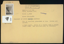 | Description: | Bit of shoulder preserved at top. Broken all around. A head right. Above it a double then a single black line. The outlines gray to lavender. | |