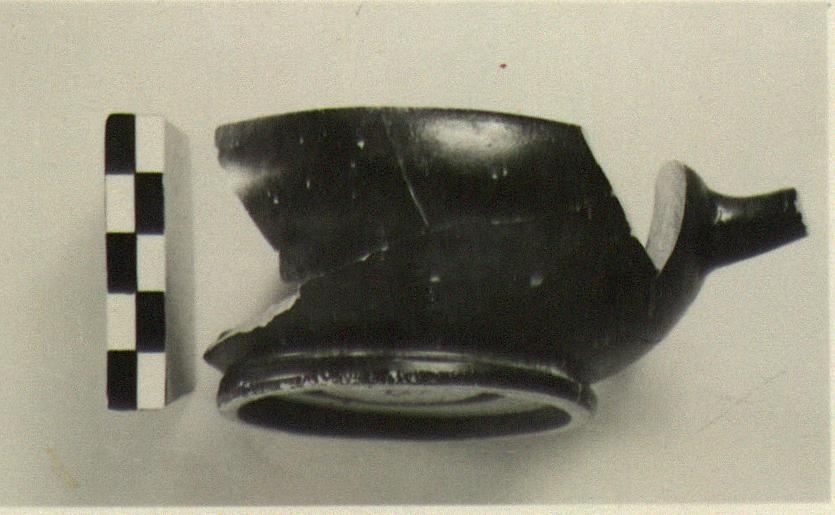 | Description: | Part of handle and much of one side missing. On underside alternate bands of black glaze and miltos. Scratched in dry clay of underside: Δ Ε | |