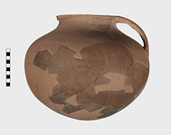 | Description: | Many fragments missing; no trace of handle remains. Restored in plaster. Round bottom; thickened, slightly flaring lip. Gritty brown clay; handmade. | |