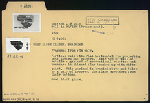 Description:   Fragment from rim only. Vertical wall with flat horizontal rim projecting both inward and outward. Near top of wall on outside a garland of conventional rosettes and branches in thinned clay touched up with white paint. This garland is bordered above and below by a pair of grooves from which the glaze is scratched.