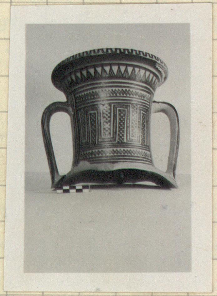 | Description: | Complete neck; one handle broken off but repaired. Inside of lip, a black band; outside, plain maeander. Below lip, between two narrow bands above and two below, cross-hatched triangles. Handle zones marked off by two vertical lines. On front and back panels: above and below, crossed zigzag lines, dotted, between series of three narrow bands; between, plain vertical maeander, hatched; the bays filled by checkerboard pattern. On handles, three union jacks separated from each other by three horizontal narrow bands. Slipped; dull black glaze. | |