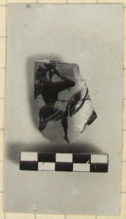 | Description: | From an early lekythos. Two non-joining fragments. (Possibly not from the the same pot.) a) Man in short skirt running right, looking back; in front of him, the shield and leg of another warrior. b) From shoulder: head and shield of a warrior left, helmeted. Purple red retouches, hasty incisions. | |