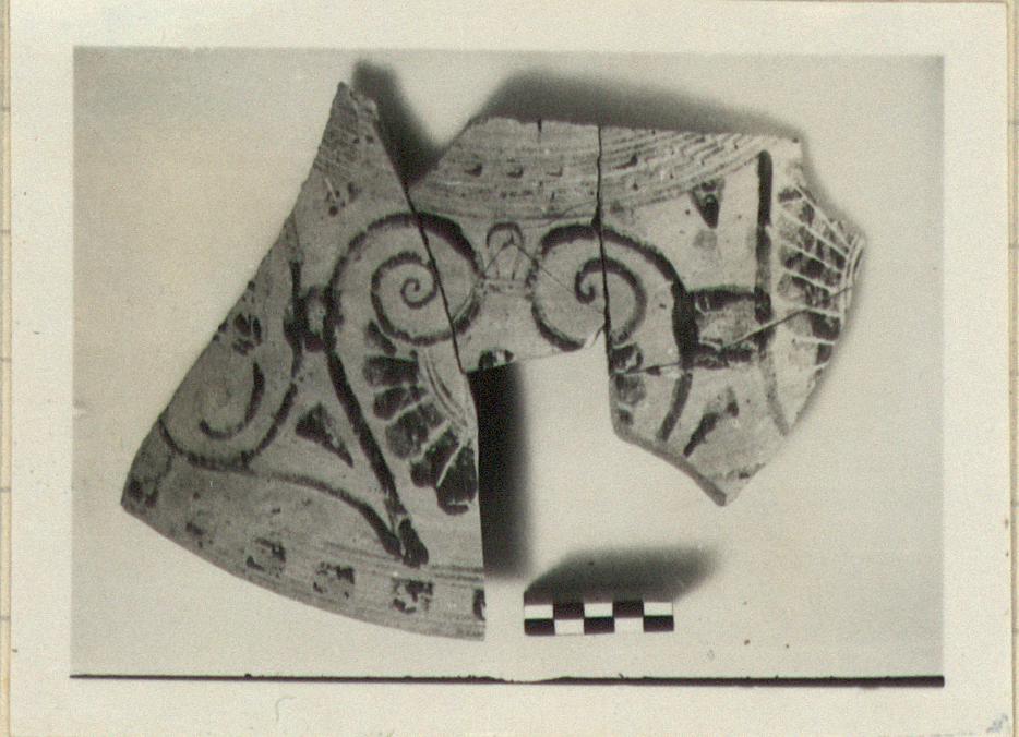 | Description: | a) Part of a very large shallow conical lid, decorated outside with rays around handle-base, then bands and step-pattern. Interlacing incised palmettes, and dots between lines around outer edge. Attic clay, slipped; dull black glaze, somewhat peeled. Unglazed inside. b) Ζ 1663: Rim and outer part. Preserved is part of a large palmette with adjoining tendrils; around the edge a border of small solid squares between lines. Incision for the palmette. Black glaze much flaked. | |