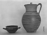 Description:   a) Pitcher with high convex body and high concave neck ending in plain lip; one vertical strap handle, lip to shoulder. False ring foot. Body to shoulder covered with black bands; shoulder (handle-band) reserved, and decorated with a wavy line; neck reserved, with band at base and lip. On handle, horizontal bands and a St. Andrew's cross.