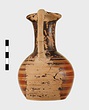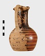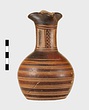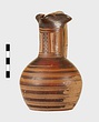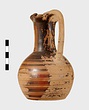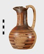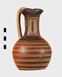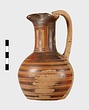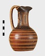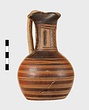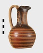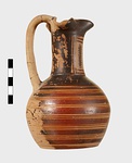 | Description: | Flat-bottomed oinochoe with rounded body, long narrow neck, trefoil lip and one vertical loop handle. Body decorated to shoulder with alternating glaze bands; one wide, two narrow. Shoulder black. Reserved metope on front of neck; bordered by two narrow glazed bands all the way round. Center of neck, checkerboard pattern flanked each side by vertical lines surrounded by dots. Rest of neck and lip, black. Handle reserved. Slipped; somewhat metallic black-to-reddish glaze, partially peeled. | |