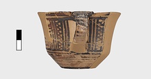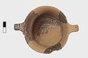 | Description: | From a cup similar to P 4986 (Β 1330), but deeper bodied and without a stand. Restored in plaster with a second handle. Flat bottom; inside, bands and interlocking hanging and standing vertical strokes. Outside, bands to lower handle attachment; on body, maeander between vertical zigzags. On resting surface, rings. | |