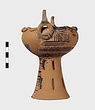 | Description: | Mended from many pieces; about a half of the cup and the start of the stand preserved. A large rim fragment, a bit of a snake, and a second bird do not join. Fragment b) is a non-joing fragment of the stand. Restored in plaster with additional fragments of the foot. Shallow bowl on perforated stand; one vertical ring handle preserved, with bird perched on top looking into cup. Around outside of lip, a plastic snake. Inside glazed black; series of strokes on lip. Outside, horizontal and vertical zigzags separated by bands. Buff clay; dull black glaze. | |