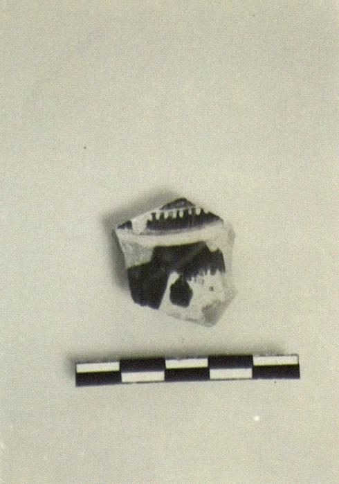 | Description: | From the shoulder of a closed pot. Woman's head right; above, part of a curved object, shield? White for flesh of woman, rim and dots inside rim, of shield; red for fillet around head. | |