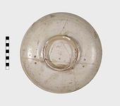 | Description: | Shallow plate on high ring foot. Mended from five pieces, a small bit missing from the edge. Three pairs of rivet holes indicate an ancient mend. Fine sgraffito decoration. Nicked edge; then two bands of conventional pattern. In the central medallion, against a background of tendrils, an animal (lion?) right, head turned back. Red clay, covered with white slip, and glazed all over; the glaze pale greenish on the top, colorless on the underside. | |
