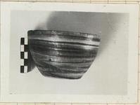 | Description: | Intact. Flat-bottomed handless deep bowl, with convex side wall and plain lip. Resting surface reserved. The rest of the bowl inside and out covered with thin streaky black glaze, probably put on while the pot was still on the wheel. Buff clay. | |