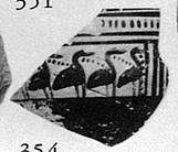 | Description: | Cup with deep convex body and high straight lip. On lip, dots between bands. In handle band, long-necked water birds in procession to the right; rows of dots in field. Inside glazed black; reserved band at lip. | |