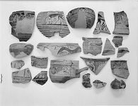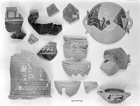 | Description: | Cup with deep convex body and high straight lip. On lip, dots between bands. In handle band, long-necked water birds in procession to the right; rows of dots in field. Inside glazed black; reserved band at lip. | |