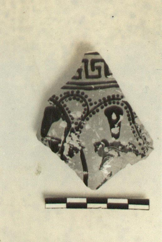 | Description: | From a closed pot, at the shoulder. Above, maeander. Below, garlanded head of Dionysos left; in front of his face a kantharos. In field grape vines and clusters. Purple red for beard and flowers of garland around his head. | |