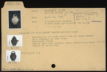 | Description: | Ring base. Adhering to the side with a bit of heavy cement is a fragment of roof tile. Coarse pink clay (5YR 6/8) showing sharp ridges from wheel. Traces of cream slip. Blackened within. | |