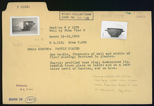 | Description: | One handle, fragments of wall and middle of floor missing; restored in plaster. Sharply profiled base ring; downturned lip. Reddish brown glaze on inside and on a band below level of handles and on base. | |