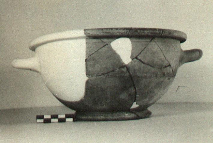 | Description: | One handle, fragments of wall and middle of floor missing; restored in plaster. Sharply profiled base ring; downturned lip. Reddish brown glaze on inside and on a band below level of handles and on base. | |