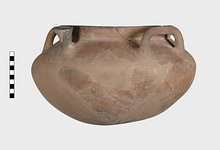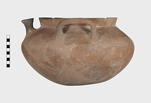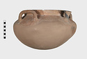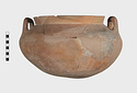 | Description: | Much of the wall missing; restored in plaster. Round bottom; two vertical handles; tubular spout rising from the shoulder; ledge for lid. Gritty micaceous brown clay; blackened by fire. | |