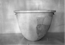 Description:   Much missing from wall; restored in plaster. Flat bottom. Massive rim flat on top. On either side a large lug beneath lip.