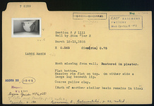 | Description: | Much missing from wall; restored in plaster. Flat bottom. Massive rim flat on top. On either side a large lug beneath lip. Coarse yellow clay. Cf. Beazley (1946), Potter and Painter, p. 17, n. 2. | |