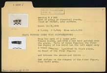 | Description: | From the neck of a large pot. Glazed inside and with a red band painted over the glaze. Parts of three figures: the first two right, of the third (at the left edge) only a tracer remains. Red stripes on the drapery of the first figure. Inscribed in black glaze, in front of the first figure: <graphic> and between the second and third: <graphic> Clay burnt gray. | |