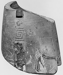 Description:   Broken top and bottom, and much damaged by burning; the glaze much peeled. Two panels, separated by vertical stripes, one beneath each ear, of maeander alternating with saltire cross.