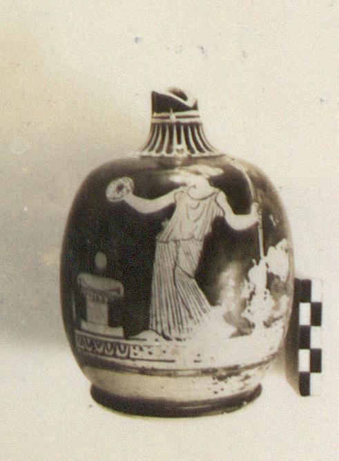 | Description: | Squat lekythos. Heavy rounded body with ring foot, one handle and a narrow neck; the handle and lip missing; a small hole broken in the back. On the body, opposite handle, and on an egg-pattern band for ground, a draped woman, left. With her right hand she pours from a bowl an offering onto the altar which she faces. With her left she grasps a thyrsos. A round object suspended in the air over the altar. At the base of the neck, a band occupying rather more than half the circumference is reserved and decorated, below two bands, with elongated petals; dots between their tips. No contours. By the same hand, P 5264 and P 5265. Cf. National Museum, Athens. N.M. 1207, N.M. 1280, both squat lekythoi. | |