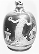 | Description: | Squat lekythos. Heavy rounded body with ring foot, one handle and a narrow neck; the handle and lip missing; a small hole broken in the back. On the body, opposite handle, and on an egg-pattern band for ground, a draped woman, left. With her right hand she pours from a bowl an offering onto the altar which she faces. With her left she grasps a thyrsos. A round object suspended in the air over the altar. At the base of the neck, a band occupying rather more than half the circumference is reserved and decorated, below two bands, with elongated petals; dots between their tips. No contours. By the same hand, P 5264 and P 5265. Cf. National Museum, Athens. N.M. 1207, N.M. 1280, both squat lekythoi. | |