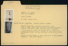 | Description: | Mended from many pieces; decoration very like P 5272, save that the foot is here concave-convex, and the upper, concave part reserved. A semi-draped youth is seated to the left of a pedimental grave stele, holding a box in his left hand. Traces of red bands on the stele and on the youth's drapery. Gray matte paint. | |