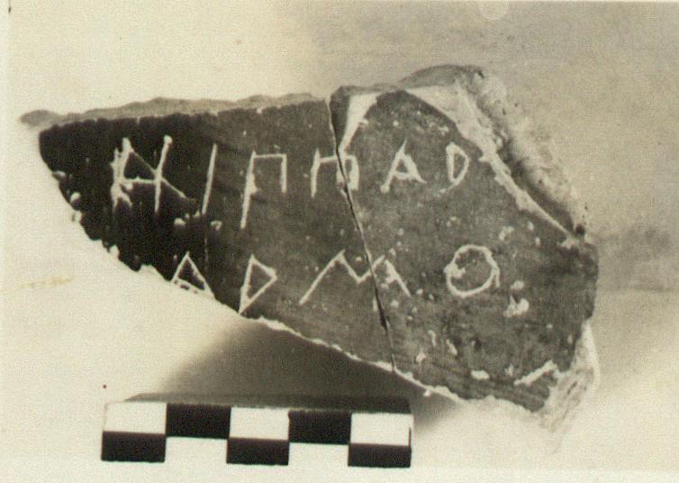 | Description: | From a large open bowl with vertical loop handles, krater, glazed black inside. Incised inside: <graphic> | |