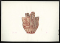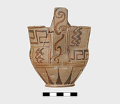 | Description: | One handle broken, but repaired. Very small chip missing from rim near handle. Low ring base. Ray pattern around the base; above this, two decorated bands: double vertical zigzags and maeander (the patterns reversed on opposite sides of cup); on handles, interlocking spirals. Clay buff. Dull glaze, reddish-brown to black; inside glazed. For motifs, cf. Pfuhl (1923) I, p. 71. S-pattern more frequent in Boeotia than in Attica. Shape and pattern show close relations with Geometric. Early Orientalizing style. | |