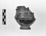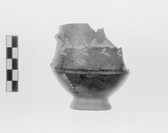 | Description: | Both handles and part of wall missing. In handle band, laurel sprays in added thinned clay paint. Traces of white on stem. Glaze much peeled; red on foot. Similar to P 5349 (Β' 583). | |