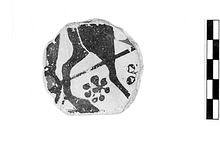 | Description: | Nearly circular fragment from plaque; a bit of the lower edge of the plaque preserved. Hind legs of animal with dot rosettes. Accessory purple; incised line between haunches. Pale pinkish-buff clay. Faintly lustrous black paint. ADDENDA Part of a chariot, wheel and pole. Resembles closely Corinthian or Black Figure plaques found elsewhere (cf. Melian vase, Pfuhl (1923), fig. 110). Cf. New York Nessos amphora for the drawing of the feet. Dated in the 3rd quarter of the 7th c. B.C. | |