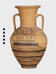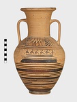 Body, from bottom to point of greatest circumference, covered with glazed bands, one wide and three narrow, alternating. At base of shoulder, band of long-necked, long-legged birds with hatched bodies, left. Between each bird, two dots. Below base of neck, on each side, three panels separated by vertical lines: outer panels filled with checkerboard; central panels with horizontal reserved zigzag, the triangles above and below cross-hatched. Neck panels front and back filled with hatched complicated maeanders; above, zone of birds left, two dots between each, above upper handle attachments. On outer face of lip, row of dots. Horizontal bands on handles.